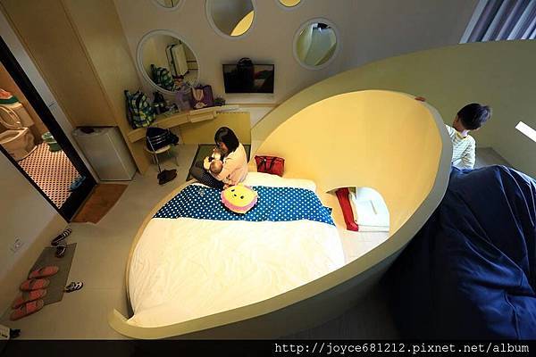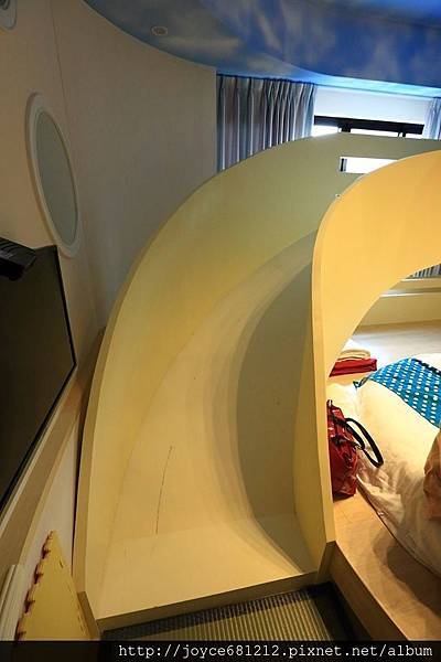 胖達人一進門興高采烈的爬上去溜,但因為滑道太陡、衝力過大,飛出去幾次後,當天不管我們如何威脅利誘,他都不願意再溜了,這也讓胖媽認真思考有無住溜滑梯民宿的必要,不過回家後,胖媽努力的爬文,才發現房間內有一個軟骨頭沙發,應該是要放在下方阻擋溜下來時的衝力,所以下次再去試試看吧?!