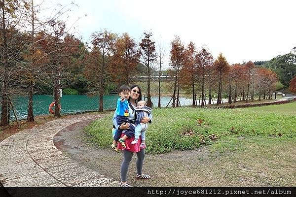從遊客中心往下看,遠處一排紅吱吱的落雨松,雖然要走一段路,還是背著小孩往目標邁進