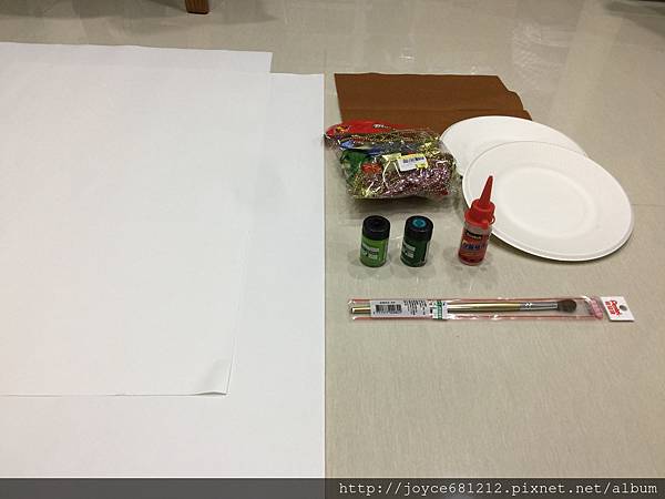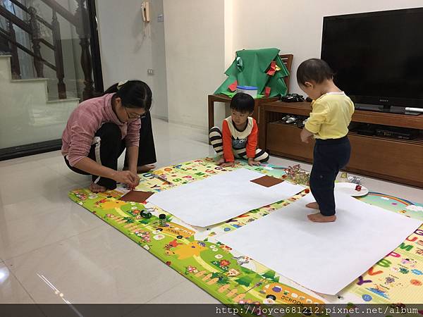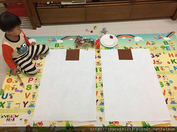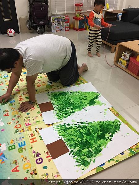 再用深綠色點綴就完成了,等顏料乾了之後,再把買來的聖誕裝飾包按照自己喜歡的樣式黏上去就好了,是不是很簡單啊!連小小的米寶都有參與到,但是ㄚ胖爸的地板被顏料沾到,就臭著一張臉,迅速拿著抹布擦地板,胖媽的手又都是顏料,無法拿手機幫米寶拍照,好可惜!不過啊~晚上睡覺之前,我問米寶,剛才是不是有畫畫,他點頭說「恩」,我問他用什麼畫畫?他就把他的手掌伸出來看,這證明了,所有的生活體驗,對小孩都是有記憶的,