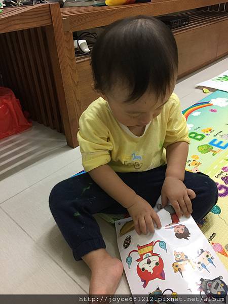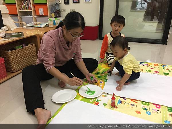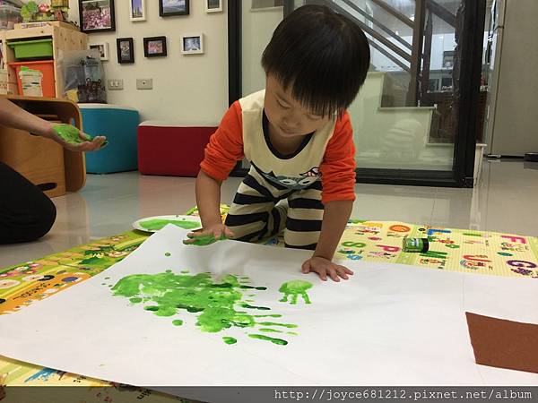 終於把他抓到正確的位置,原本是希望能夠手指朝下的蓋,結果他少爺一直沾顏料,把整張紙弄得濕答答的(但是眼神好專注喔)