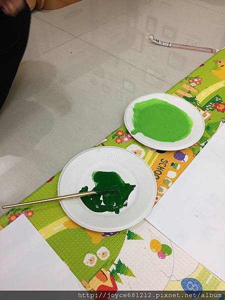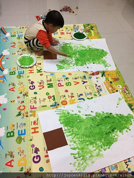 事後補拍了這張,衣服褲子都是綠色顏料的米寶,以證明他有參與過的痕跡,