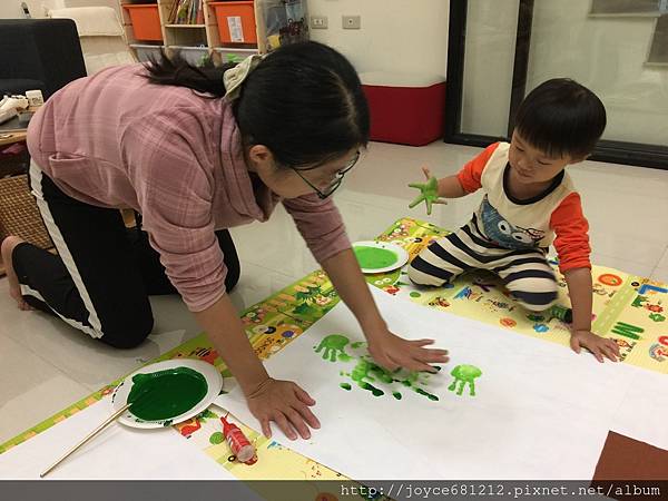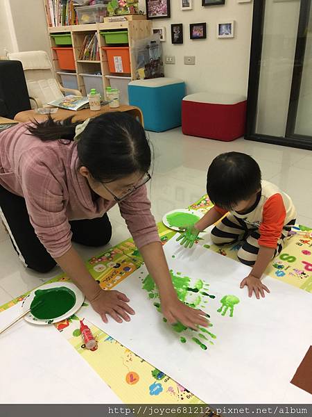 用手沾顏料蓋印在紙上面,顏色從淺色開始,我示範手的方向,但胖達人一直蓋成橫的,後來顏料多到,根本看不出手形了,