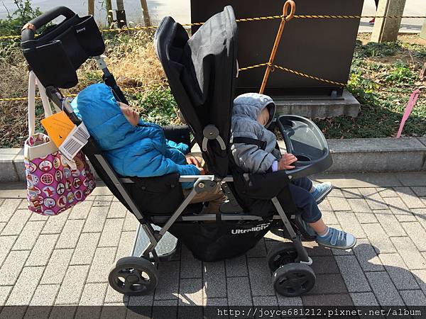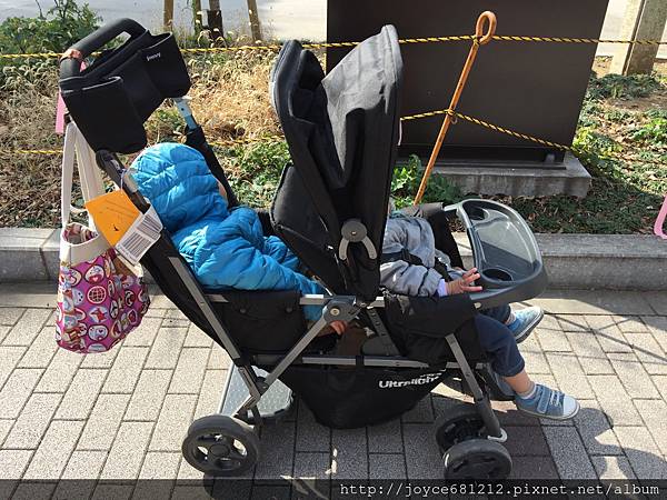 胖媽看了很多使用雙人推車的分享文之後,發現「Joovy Caboose Ultralight」的推車比較多人使用,第一次帶雙寶去臺北玩時本來也想租這台,不過因為時間太趕了,這台推車已經沒有貨了,所以改租「TinyWorld」這款,它的特色在於推車的座位是一高一低,長度比較短,但相對的高度就比較高(後座的視野比較好),