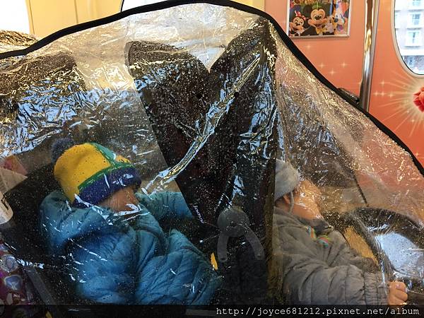 這款推車的後座若不裝第二座椅,後座那位就和前座的背對背的坐著,上下車比較方便(後座的小孩可以自己走下來),不過考慮這樣一來睡覺的時候可能沒那麼舒服,所以還是租了第二座椅,這是第一天中午從迪士尼樂園要回飯店午睡時的狀態,這個塑膠雨罩擋風又擋雨,雖然下了整個上午的雨,但兩位絲毫沒有淋溼,一樣呼呼大睡,