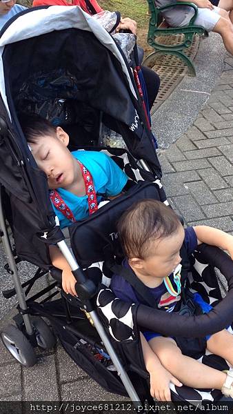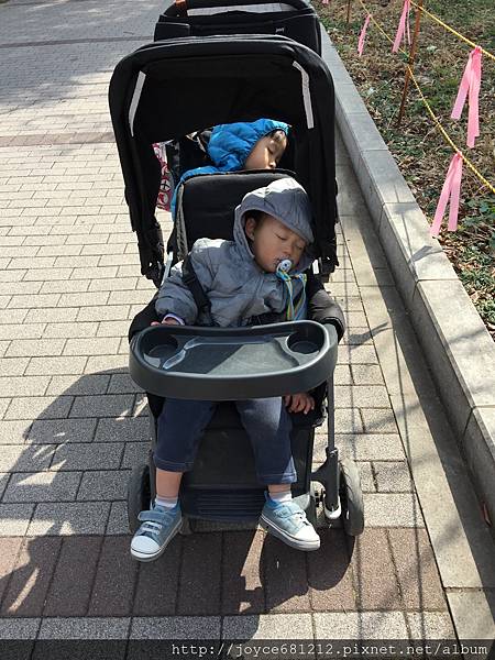 這款推車還有個缺點,就是前座平躺的角度只能到110度,後座最大可到140度,雖然米寶弟後來累了也是這樣睡,但頭會一直掉到前面的扶手,反之,後座的哥哥睡到嘴都開了