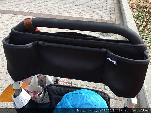 「Joovy Caboose Ultralight」還有個特別的地方,它有讓爸媽放飲料的口袋,別小看這小小的設計,飲料杯直接插在裡面,都不用怕打翻了,