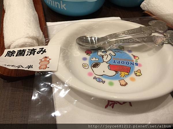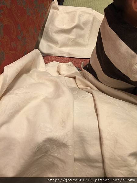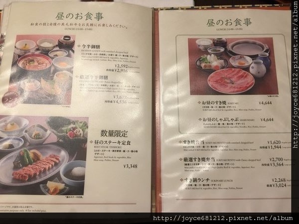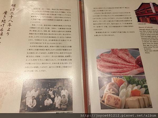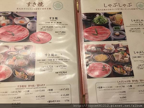 因為壽喜燒會有烤肉的煙氣,一進去店員就貼心的拿餐巾布幫我們把外套、包包全都蓋上,比較有趣的,一開始接待是一位男性的店員,知道我們不會講日語之後,來點餐的服務人員變成英文很流利的女性店員,我們就靠著很破的英文及菜單上的漢字順利完成點餐,