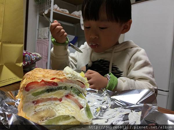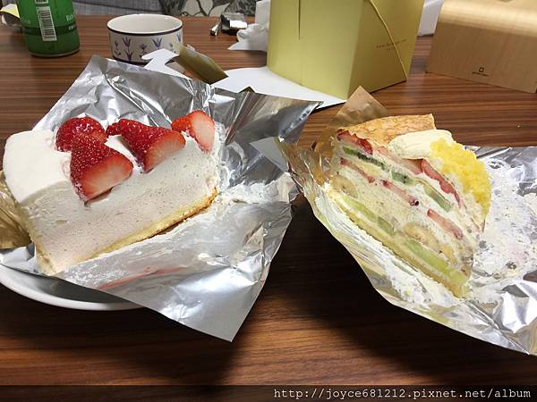 右邊這個就是店內招牌水果千層蛋糕,雖然沒有很甜,但帶著水果本身的甜味,夾層的奶油不會讓人覺得很膩,搭配著千層蛋糕本身一層一層的口感,和一般的千層蛋糕完全不同(有些千層蛋糕的奶油會讓人在吃完之後產生一股甜膩的噁心感);左邊這個則是草莓慕斯蛋糕,因為我們正逢草莓的產季,而草莓又是小小孩的心頭好,果然兩位把草莓吃完,裡面的慕斯就不吃了,比較起來,這個草莓慕斯就沒有那麼令人驚艷(慕斯本身是很細緻),不過可能胖媽吃的時候,草莓已經被完食,沒有水果的加持,奶油加上慕斯,少了清爽感,