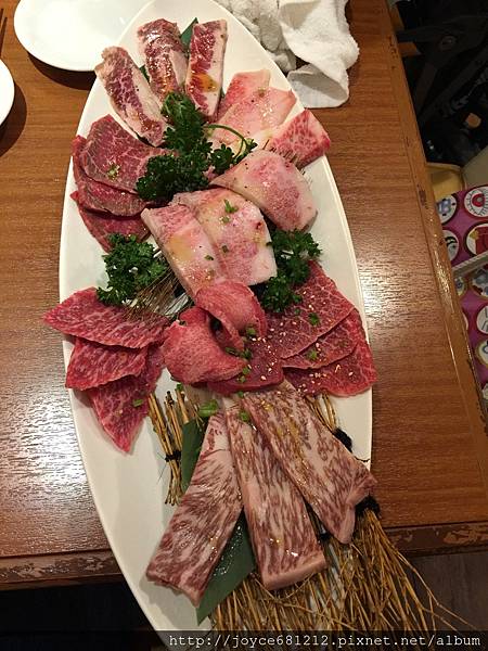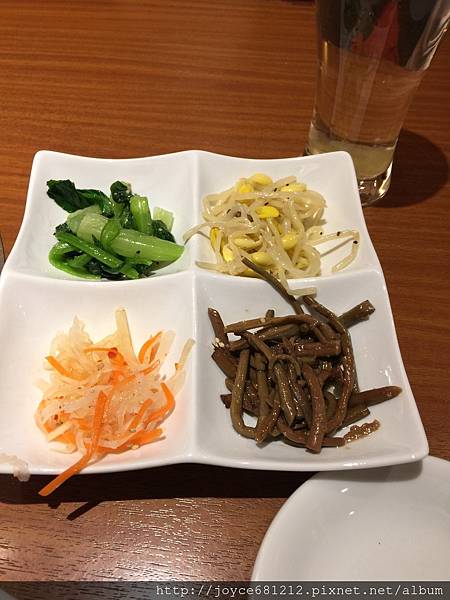 我們點了一份小菜和燒肉盛合(就是涵蓋各種部位的肉片,簡單來說就是綜合口味),到日本8天,還沒讓ㄚ胖爸好好吃一頓燒肉,這最後一天的晚上,還剩下一張1萬日幣的紙鈔,就決定以此作為點餐的上限,以彌補一些白天在GALA滑雪場消耗的能量,並為第一次的親子自由行劃下美好句點,為了節省看菜單的時間,直接點了一份綜合口味的燒肉(以致於根本不知道吃的是什麼部位的肉),