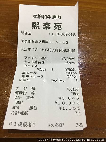 在我們住的民宿附近有間很有名的燒肉店-鶯谷園(在tabelog上的評分高達4.10分滿分是5分,聽說只要超過3.5分都算好吃的),相較於日本燒肉店偏高的價位,鶯谷園屬於價格較為便宜又好吃,簡單來說就是CP值高,所以很多部落格都有介紹,不過它位於鶯谷車站南口,而我們的民宿從北口進出比較近,每天晚上回去都很晚了,就沒有特地繞過去訂位,等到要吃的時候,店員告訴我們「只接受有訂位的客人」(所以記得要先訂位、要先訂位、要先訂位!!!很重要),還好不遠處有一間熙樂苑燒肉店,出乎意外的也很好吃喔!證明了日本的燒肉店隨便找都好吃的傳言