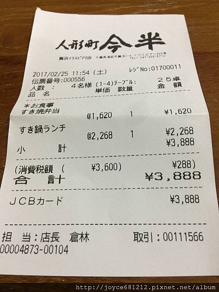 這是當天用餐的費用,日幣3888折合台幣大約1千多元,這趟東京行,胖媽家的午、晚餐幾乎都是這樣的價位(差別只是份量多少不同),也算吃得很好了,