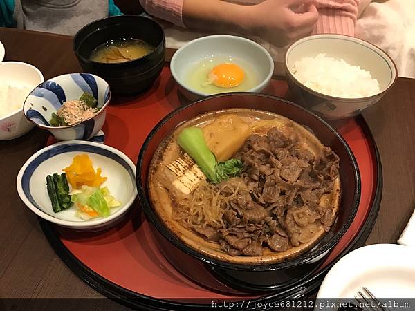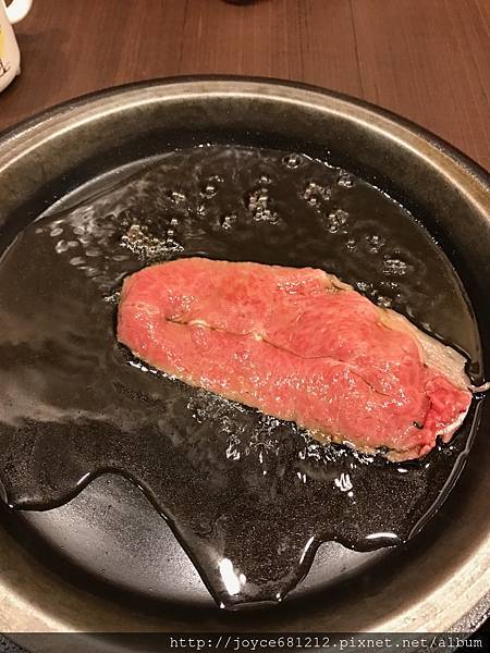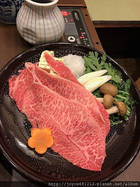 接著ㄚ胖爸問了一個很有深度的問題「壽喜燒應該怎麼吃?先放肉還是菜?」在台灣都不管先後順序的亂放食材,但看到這美美的牛肉,心生不捨,覺得亂放好像白白浪費了牛肉,於是四處查看別桌的日本人,不過我們是在一開店的11點就進去,餐廳本身沒什麼人,終究還是亂放了